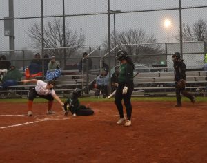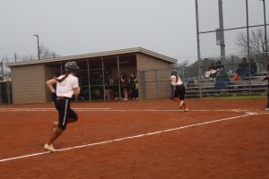Pitcher Presley Leal ’28 rushes to home base to tag Cedar Park batter out.